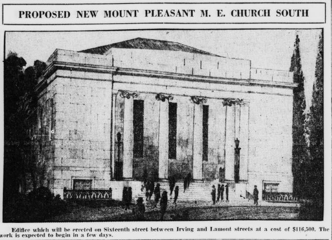 The “large and beautiful” library matched the grandeur of other buildings on 16th Street and inspired the redesign of the modest, brick Mt. Pleasant Methodist Episcopal Church South, a few doors down. The July 9, 1927 Evening Star described the church’s façade as “a front of massive dignity in harmony with other imposing buildings in this section of Sixteenth street.”