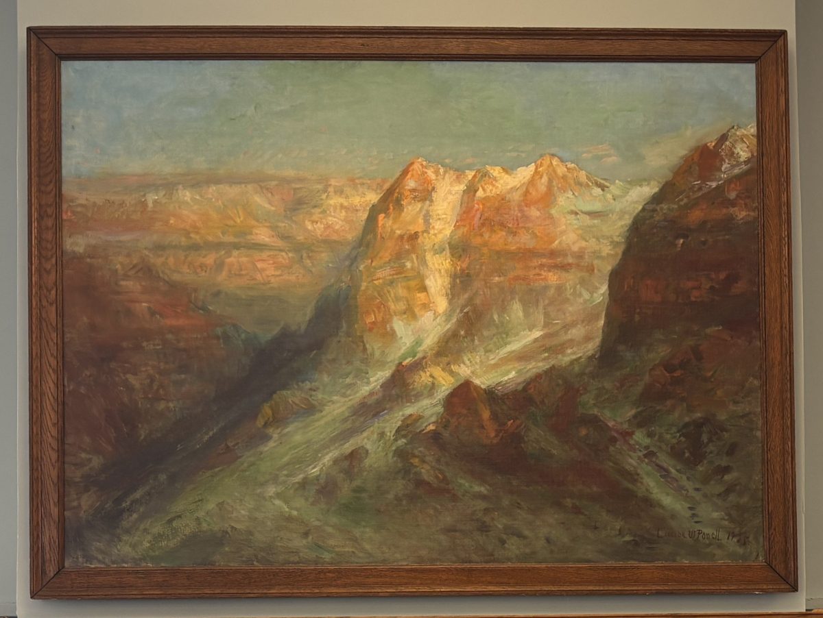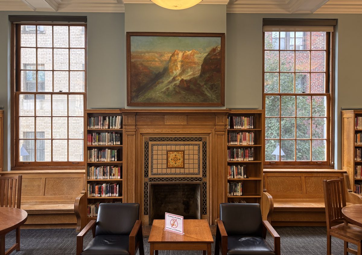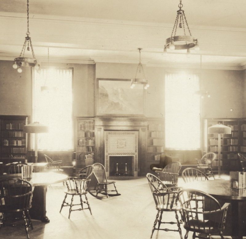 “To one passing the building at night the library looks like some fashionable clubhouse, with its long windows, its mellow lights and its dignified proportions. Within, the comfortable chairs and the general atmosphere of intellectual activity, the Powell painting of the grand canyon, presented by Mrs. John B. Henderson, and the gay, fresh bindings all contribute to the effect.”