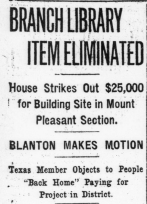 Then, on January 3, 1923, Texas Representative Thomas L. Blanton, a member of the House District Committee and Mt. Pleasant resident, had the item eliminated from the District appropriation bill, saying that people in other parts of the country “ought not to be taxed to pay for the branch library or site in Mount Pleasant.”