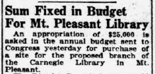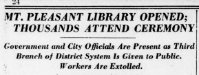 The Mt. Pleasant branch library opened with about 11,000 books and 100 magazines. Appropriations of $40,000 over the next two years were expected to vastly increase those numbers. At its opening, because of understaffing, only the main floor was opened and restricted to adults and high school students.